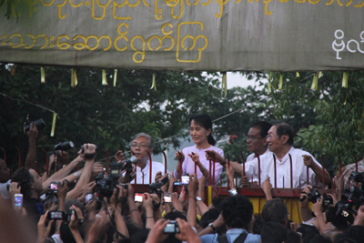 | Aung San Suu Kyi, centers, appears at the gate of her Rangoon home on Nov. 13 to speak to her supporters soon after her release from more than seven years of house arrest. (Photo: The Irrawaddy) |
