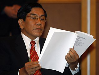 | Burma's Foreign Minister Nyan Win reads a document during a ministerial retreat at the Asean Ministerial Meeting in Singapore in 2008. (Photo: AP) |