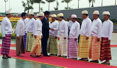 It looked like a fashion show, a fashion show by the serious and hawkish Burmese generals. The Burmese people saw their ruthless, ruling generals entertaining them like traditional stage comedians. Looking at the picture, the people smiled or burst out laughing. Eleven ministers, the prime minister, the foreign minister and other ministers, wore colorful, silk sarongs, old-style white traditional jackets, Burmese turbans (in matching colors) and one-inch high velvet sandals as they welcomed visiting Laotian Prime Minister Bousasone Bouphavanh to Napyidaw, the capital of Burma, in late June. No one has seen a group of military rulers dressed in such costumes in the past two decades, since the current regime staged a coup in 1988. Their predecessors, members of Ne Win’s authoritarian Socialist regime, used to wear similar dress in their hand-picked parliament between 1974 and 1988.